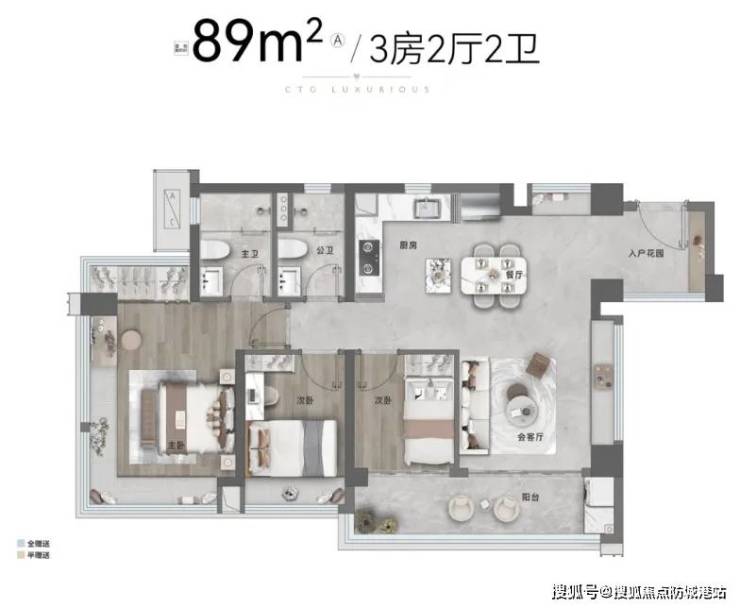 89㎡三房两卫:总价168万起,东南向望小区园林,6米景观阳台,主卧配270°飘窗;