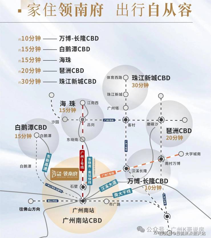 项目坐拥双地铁+双主干道+湾区枢纽的立体交通网络,构筑畅达全城、辐射湾区的高效出行体系。轨道交通方面,距地铁2/7号线石壁站仅约300米,步行便捷可达;7号线1站直达广州足球公园,3站畅达长隆,4站直达万博CBD,串联万博-长隆-南站黄金走廊;2号线、22号线、广佛环线高效衔接,快速直达珠江新城、金融城、琶洲、白鹅潭等主城核心区。道路交通方面,汉溪大道、石洲中路构成城市主干路网,自驾高效畅达全城各核心板块。枢纽配套上,项目1站直达广州南站,依托亚洲顶级交通枢纽,轻松实现全国高效出行。项目更紧邻南城中轴广场,步行可达,无缝衔接枢纽配套与城市资源,交通便利性冠绝南站板块。官方售楼处电话400-9908-525转800可获取完整交通动线规划。