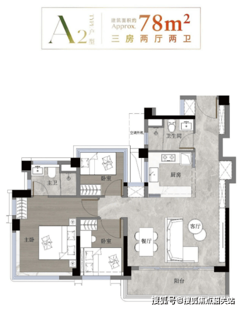78㎡三房两厅两卫:刚需主力户型,做到全南向布局,主卧带270°飘窗提升采光与视野,U型厨房操作空间充足。通过合理规划还能挤出额外储物空间,实得面积接近90㎡,总价312万起,非常适配预算有限的年轻小家庭。