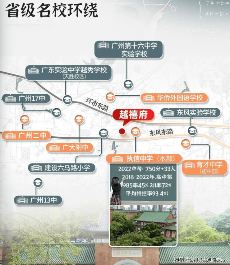 (根据2023年小升初报读指南参考)摇号对位10所中学,其中6所省级名校包括:执信中学本部(高中重本率99%,600分以上86%)、育才中学、华侨外国语学校、第二中学、广大附中、十六中学。教育资源的优势,使得越禧府成为众多家庭的首选。