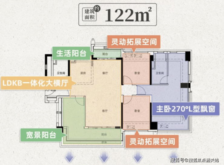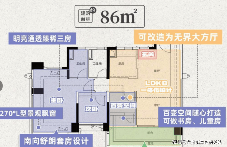 建面86平,三房两卫LDKB设计,南向景观大阳台,全屋动静分离,阳台连通次卧,约6.4米长,主卧带270度景观飘窗,总价266-310万左右。