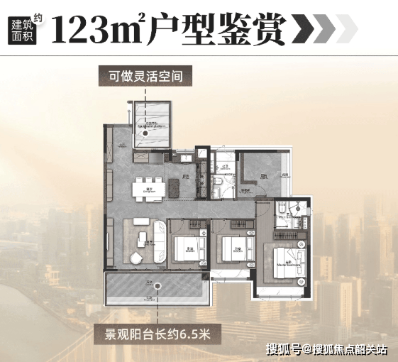 建面约123㎡的户型,创新性地打造了"4+1房”格局。四开间朝南,双面宽景观阳台长约6.5米,确保了室内充足的采光与通风。最精妙之处在于其“魔方空间”设计:设备空间、厅卧等区域均可灵活改造,相当于在三房的基础上增加了两个多功能室。这种格局在同面积段产品中绝无仅有。若将厅卧合并,可形成一个约62㎡的LDKG(客餐厨阳)大方厅,空间阔绰程度远超普通两房,足以承载家庭聚会、亲子互动等多种社交场景。