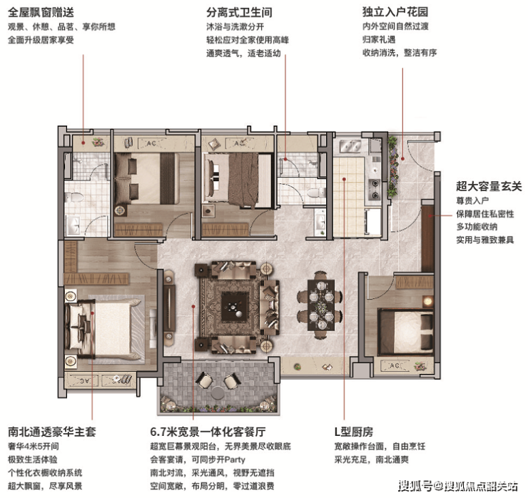 全屋智能品牌交标,精选西门子、科勒、高仪、狄耐克、史密斯等一线品牌,配置风管空调、新风系统、智能情景灯控、智能马桶、电动窗帘轨道、嵌入式洗碗机、净水器、碎骨机等,打造都市新贵生活剧场。