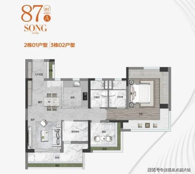 保利和颂项目中还有一种户型是建面积为87平方米的南向户型。该户型拥有独立的入户花园,为居住者提供了私密的室外空间。