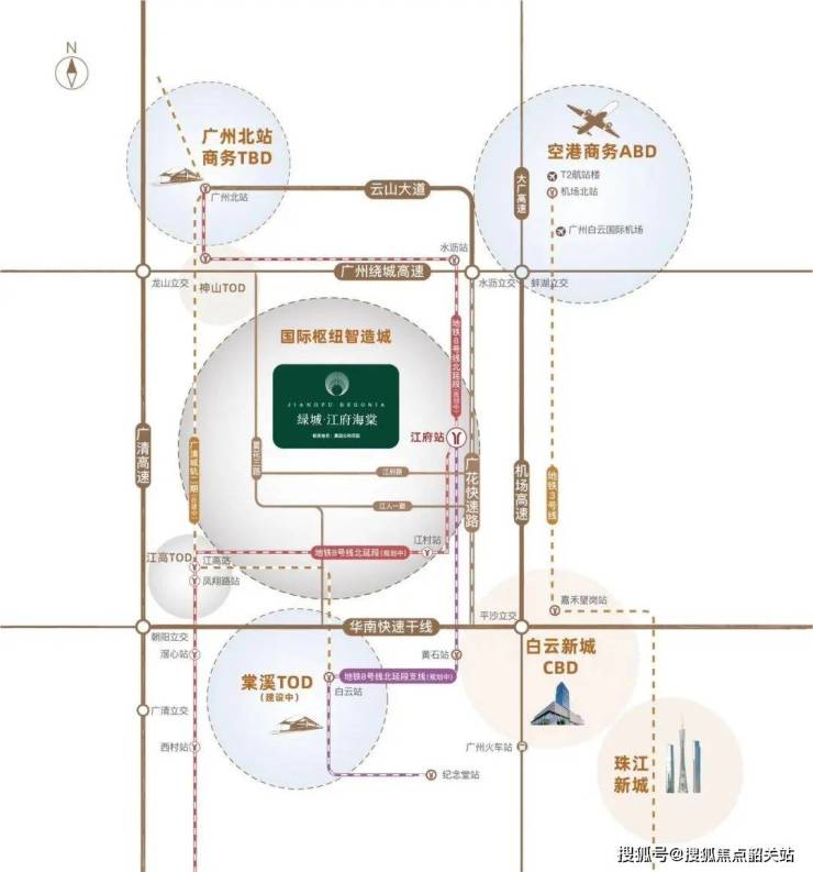 绿城·江府海棠位处广州北部最重要的交通枢纽白云新城北部,项目本身就是集8号线北延段(建设中)、8号线北延段支线(建设中)、空港大道、广清城际和广佛环线等于一体的交通要塞,位于广花路430号上述两条地铁的交会站——江府站双地铁上盖,日后便捷往返越秀和海珠等区,通过接驳广清城际畅达广州火车站。