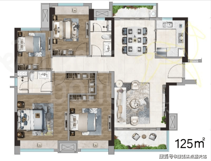 约120㎡四房两厅两卫:进一步提升了居住空间的舒适度,适合大家庭居住。