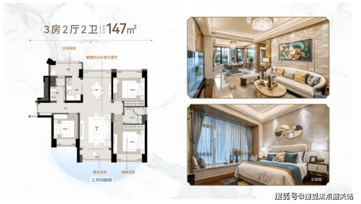 147㎡户型亮点:横厅设计,客厅宽敞明亮,连接南北双阳台,通风效果极佳;主卧套房配备独立卫生间和超大衣帽间,提升居住舒适度;厨房为U型设计,操作空间充足。