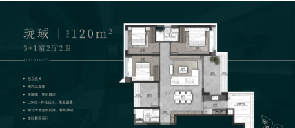 建面约120-124㎡(入门级奢华):四房两厅两卫,空间零浪费,通过极致的设计优化,实现了堪比140㎡的空间体验,是精英阶层的首选。