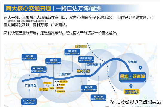 保利领秀海所在的莲花湾板块正打造成为广州不可复制的 “黄金动脉”。莲花湾板块汇聚了南大干线等重要交通干线,以及规划中的多条轨道交通,形成了连接广州主城与湾区各市的交通网络,是人流、物流、资金流的重要通道。