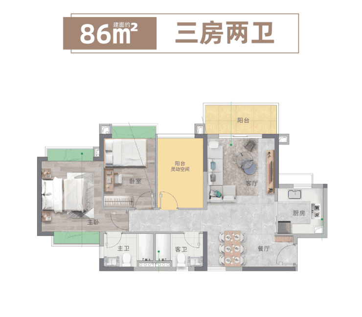 其次,N+1户型设计,得房率高,实用性强。项目所有户型均采用N+1多功能设计,预留灵活空间,可根据家庭需求改造为儿童房、书房、客房等,最大化利用空间,满足家庭不同阶段的居住需求。其中,建面约86㎡产品更是做到了惊人的三房两卫,得房率超9成,在同面积段户型中极具竞争力,完美解决了刚需家庭“小户型、大需求”的痛点。