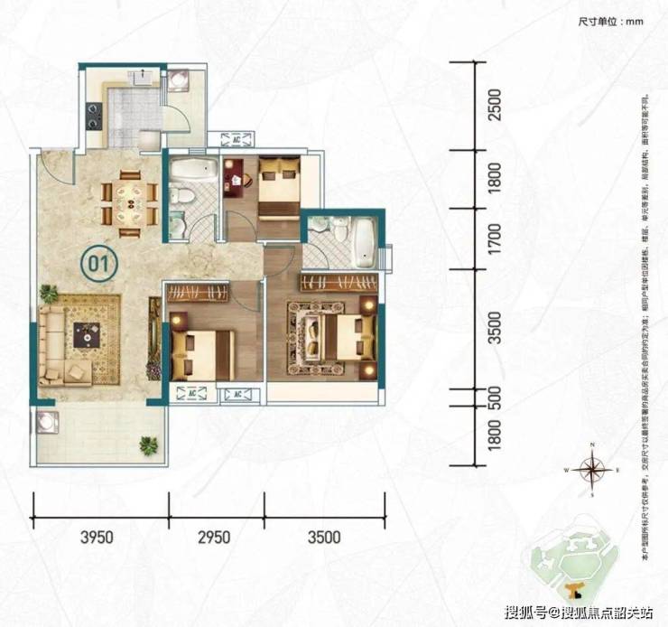 1栋01户型 115平米 3房2厅2卫1厨 平层 东南