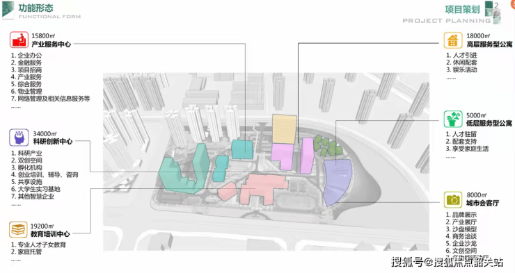 规划功能区:①创业集群:办公基地;②人才公寓:菁英住区;③城市展厅:事业窗口;④教育培训中心:人才摇篮;⑤园林会客厅:交流平台。
