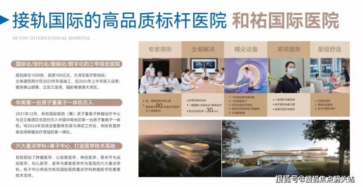 项目毗邻和祐国际医院(北滘首个规划三甲标准医院),投资总金额超过100亿元人民币,一期预计2024年6月正式投入运营;