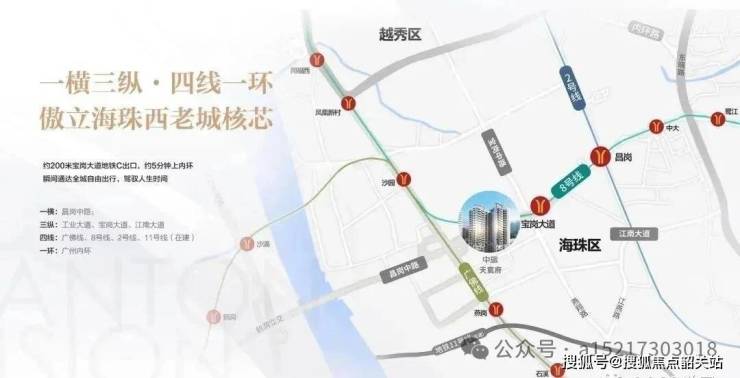 中旅天宸府坐拥主城罕见的高效立体交通网络,轨道路网与地面路网双重加持,出行便捷度领跑海珠西。项目距地铁8号线宝岗大道站仅约150米,步行即可轻松抵达,乘坐地铁可快速通达陈家祠、海珠广场、珠江新城、琶洲等核心商圈与商务区,通勤效率极高。周边无缝衔接广佛线、2号线等多条骨干地铁线路,跨区出行、城际往来均十分便利。地面交通方面,紧邻昌岗中路、工业大道等城市主干道,自驾出行四通八达。社区门口即有多条公交线路停靠,公共交通选择丰富,全方位满足不同出行习惯人群需求,无论是日常上班、子女就学还是周末休闲娱乐,都能实现高效畅达。