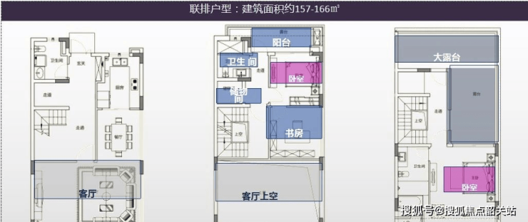 联排别墅:面积在157至166平方米之间,南北向户型设计,交楼时为简装修,并预留电梯位,洗手间和衣帽间空间宽敞。