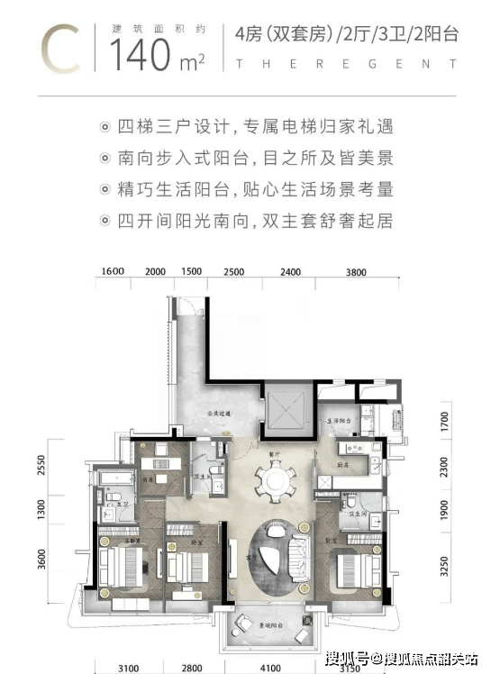 C户型(约140㎡):南向园景大宅,三房两厅两卫,高得房率,是首次改善客户的优选。