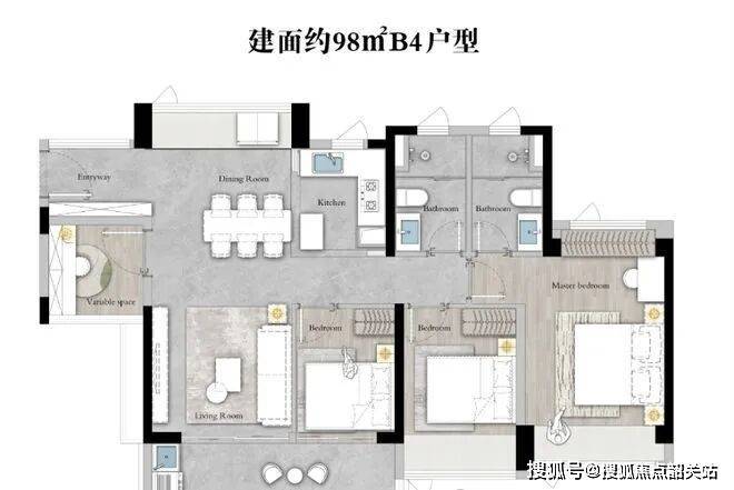 约98㎡四房两卫:四开间布局,客厅与阳台连通,次卧可改造为儿童房或多功能室,满足二胎或三代同住初期需求;