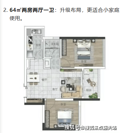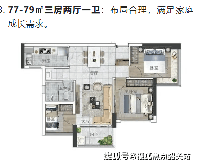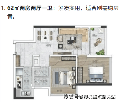 在售户型建面:62㎡两房、64㎡两房、77-79㎡三房、89㎡3+1 四房