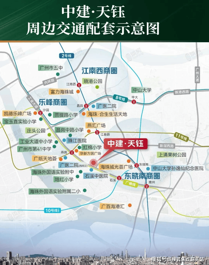 中建天钰位于海珠区核心地段,距离广佛线燕岗站约750米,石溪站约900米,步行即可到达。此外,未来石溪站将成为广佛线和10号线的换乘站,可直达珠江新城,实现东西南北方向的快速通达。项目通过工业大道与新滘西路连接,自驾出行也十分方便。