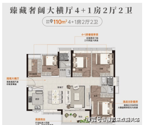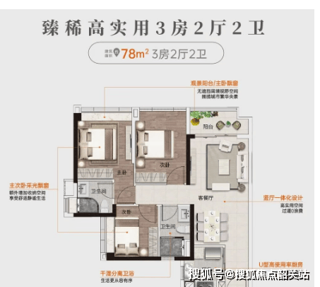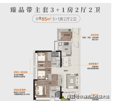 以建面约 85㎡的 4 房 2 厅 2 卫户型为例,该户型采用东南向设计,可望园林及泳池,视野开阔。双次卧带飘窗,增加了使用空间和采光效果。主卧配有独立卫浴空间,大飘窗私藏生活小时光。此外,该户型的布局合理,动静分区,客厅、餐厅与卧室相互分离,互不干扰,让居住更加舒适。