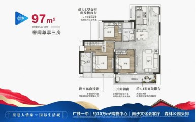 约97平方米3房两厅两卫,南北对流,全南向观景阳台;