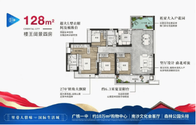 约128平方米4房两厅两卫,入户口花园,6.3米宽景大阳台。