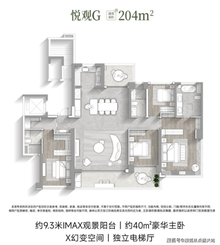 LDKG一体化设计,同享约9.3米南向IMAX观景阳台,约40㎡豪华主卧套房,静谧休憩,惬意起居,X幻变空间,多元共享。