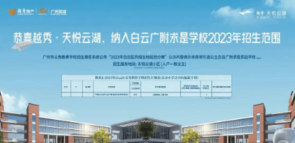 教育配套:教育资源得天独厚,已被白云广附(广州市白云区白云广附云湖实验学校)划为学区。这所九年一贯制学校,拥有 30 班小学和 18 班初中,已正式开学,2024 年 9 月将开到 2 年级和初二,并逐年往上升。白云广附云湖学校师资力量雄厚,以白云广附核心学校金广附为例,近年来中考成绩一直名列广州前茅,2023 年不仅拿下广州中考最高分 770 的佳绩,5 月底公布的 2023 届广州中考自主招生初审名单中,入围人数更是全市之首。学校除常规教育配套外,还设有美术展厅、阅览室等十多种功能室,为学生兴趣培养提供良好环境。