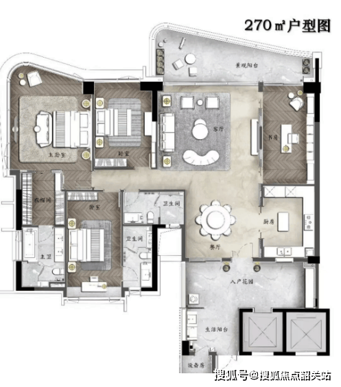 第一种是被称为“王牌户型”的建面约二百七十平方米环幕江景四房。这个户型堪称豪宅中的典范,拥有约九米超大的邮轮式阳台,一线望江无遮挡,视野极其开阔。专梯专户的设计,确保了极致的私密性。墅级空中双花园设计,约二十八平方米的超大私家庭院,让高层住宅也能拥有别墅般的天地感。多功能空间的设置,满足了家庭多样化的需求。约四十二平方米的超大主卧空间,搭配二百七十度环幕江景,阔绰的双主套房设计,让主人和女主人都能享受到尊贵的居住体验。站在阳台上,三江汇聚的壮丽景色尽收眼底,仿佛置身于画卷之中,心旷神怡。