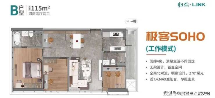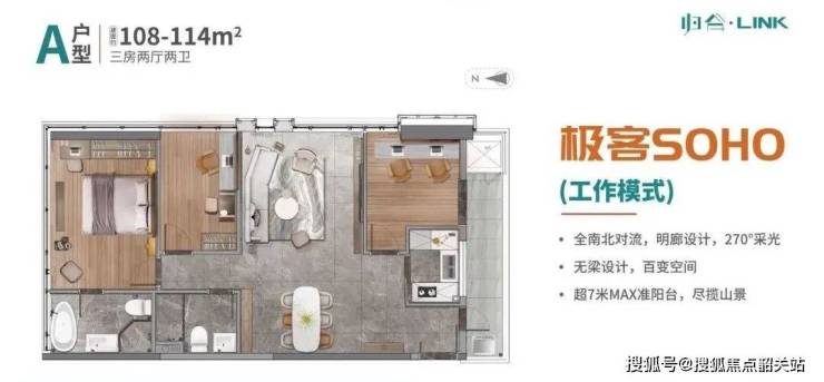 归谷·Link以现代城市生态理念为核心,注重建筑与自然环境的融合。项目采用全南北对流设计,户型方正,无梁结构提升空间灵活性,实用率接近80%。全明廊设计与270°全景采光,搭配观景飘窗,为居住者带来舒适明亮的生活体验。108-109㎡三房和115㎡四房单位提供阔绰空间,大面宽阳台设计进一步优化采光与通风效果,使住宅功能与舒适度兼顾。