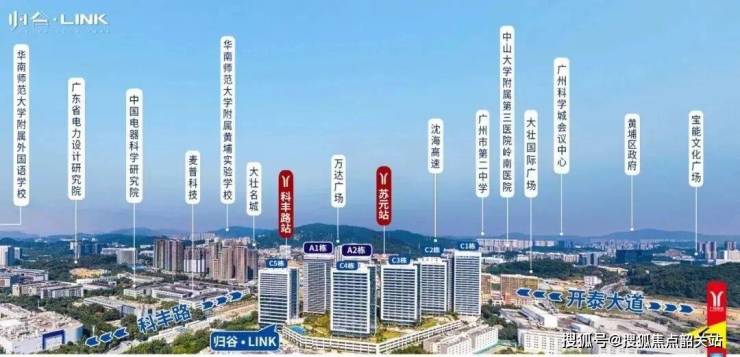 归谷·Link交通便捷,三条地铁线路交汇。项目门口即是7号线二期科丰路站,距离不足百米;北侧约800米为6号线、21号线交汇的苏元站,实现科学城及广州核心区域快速通达。周边三横两纵高速道路布局,包括开泰大道、开创大道、沈海高速、科丰路及环城高速,为自驾出行提供便利。