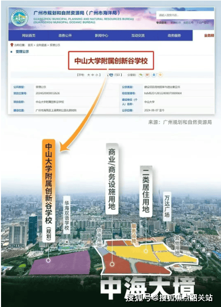 中大附创新谷学校意义非凡,其建设单位是中山大学,由中大自主管理办学,教学理念和方案与目前的中大附一脉相承。该校历经 6 年规划,如今正式公示受理,尘埃落定。海珠中部原本优质初中稀缺,而这所巨无霸体量的学校,包括 72 班完全中学和 18 班小学,补齐了海珠的教育短板。据数据显示,今年中考,中大附成绩斐然,前 50 名均分 748.4 分,前 150 名均分 730.5 分,远超广州中考一梯度投档线 702 分。2023 年第一批自主招生中,93 人入围广州头部高中,位列海珠第一。此外,项目旁边现有华海九年一贯制学校,即华附海珠国际双语学校,项目西北面直线 2 公里就是中山大学,教育氛围浓厚。