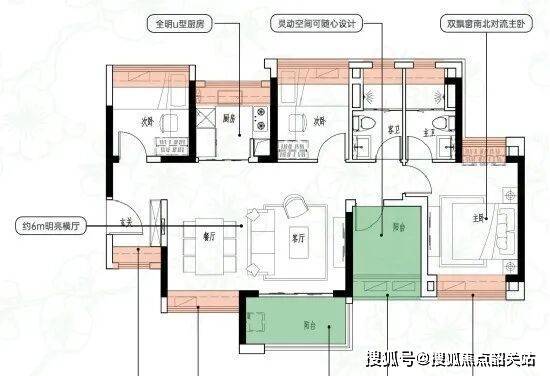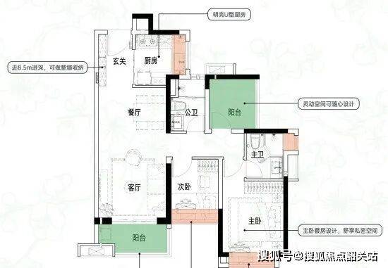 建面约84㎡三空间两厅两卫,得房率约93.5%