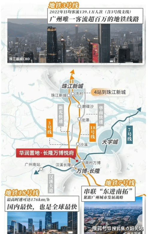 项目享有三地铁交汇(3号线、7号线汉溪长隆站步行约5分钟,18号线南村万博站约1.2公里)和快速路网(紧邻汉溪大道、新光快速、华南快速)的优势,使得居民可以轻松实现3站直达琶洲,4站至珠江新城的目标。此外,距广州南站仅约6公里,方便快捷连接全国各大城市,极大地方便了居民的出行需求。