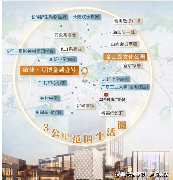 敏捷万博金湖壹号位于番禺万博 CBD 板块,紧邻金山湖文化公园,地理位置优越。交通方面,距离地铁 22/26 号线市广路站约 800 米,22 号线(时速 160 公里)可快速通达广州南站、白鹅潭 CBD、白云机场,一站换乘 18 号线;26 号线规划通达珠江新城、琶洲、金融城等核心区域,公共交通便捷;自驾可通过 “五纵五横” 立体路网,快速抵达万达广场、天河城等商圈,几首歌时间即可享受万博成熟商业。周边配套丰富,斜对面是祈福缤纷汇,3 公里内有万达广场、天河城、四海城,K11(待开业)、万象系商业等高端配套逐步落地;医疗方面临近优质医疗机构,休闲可直达金山湖文化公园,生活便利性与品质感兼具。