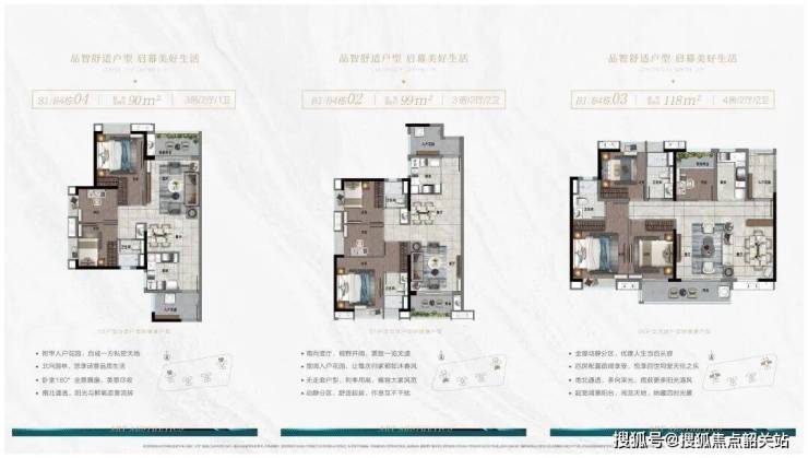 B2、B3栋103-118平方米三四房舒享户型,在B1、B4栋户型基础上进行优化升级,进一步提升空间舒适度与实用性。该系列户型同样采用南北通透设计,全明格局,每一个房间都有良好的采光与通风条件。103平方米三房户型,空间布局合理,客厅与餐厅一体化设计,连接景观阳台,极大提升了空间的通透感与利用率;厨房紧邻餐厅,动线合理,方便上菜与清洁;主卧配备独立卫生间,其余卧室均带有飘窗,增加空间利用率与采光效果,全面提升居住舒适度。