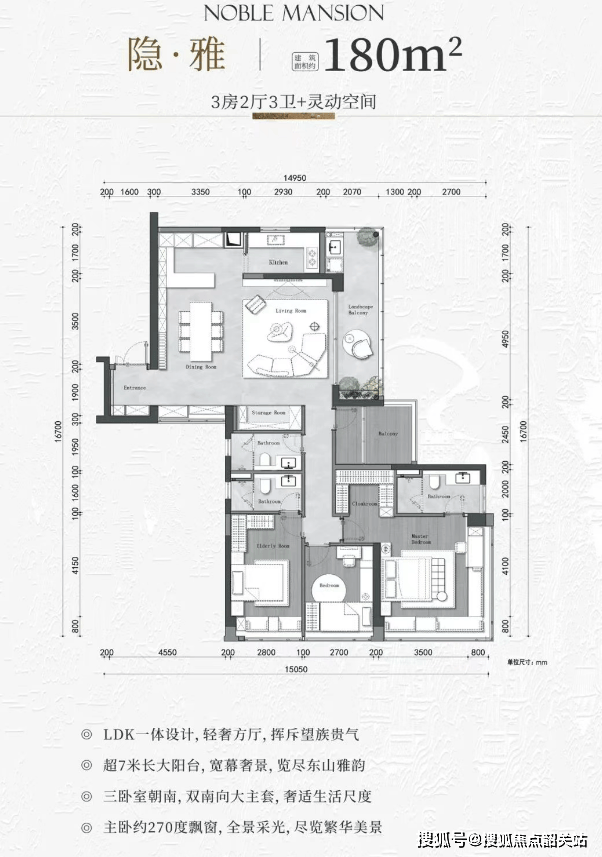 180㎡ | 4房2厅3卫:270°环幕视野,双主套设计,东南瞰天际。