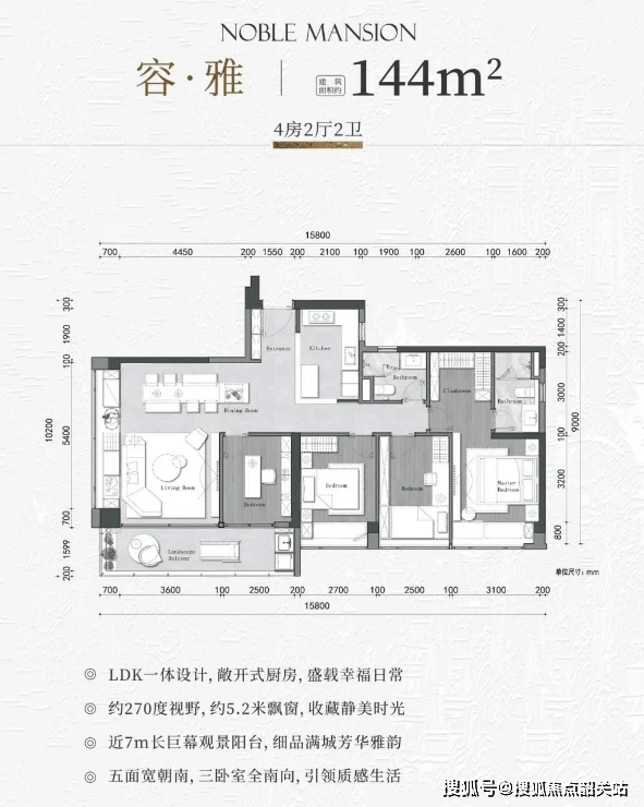 144㎡ | 4房2厅2卫:全南向卧室,5.2米全景飘窗,正南瞰城央。