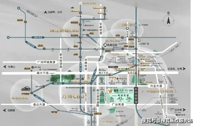 项目位于南大干线与兴业大道交汇处,直线距离大学城3公里、万博商圈8公里、珠江新城15公里。根据2025年《广州市交通发展规划》,地铁12号线支线(大学城南-新造)将于2027年通车,项目最近的新造站车程仅5分钟。