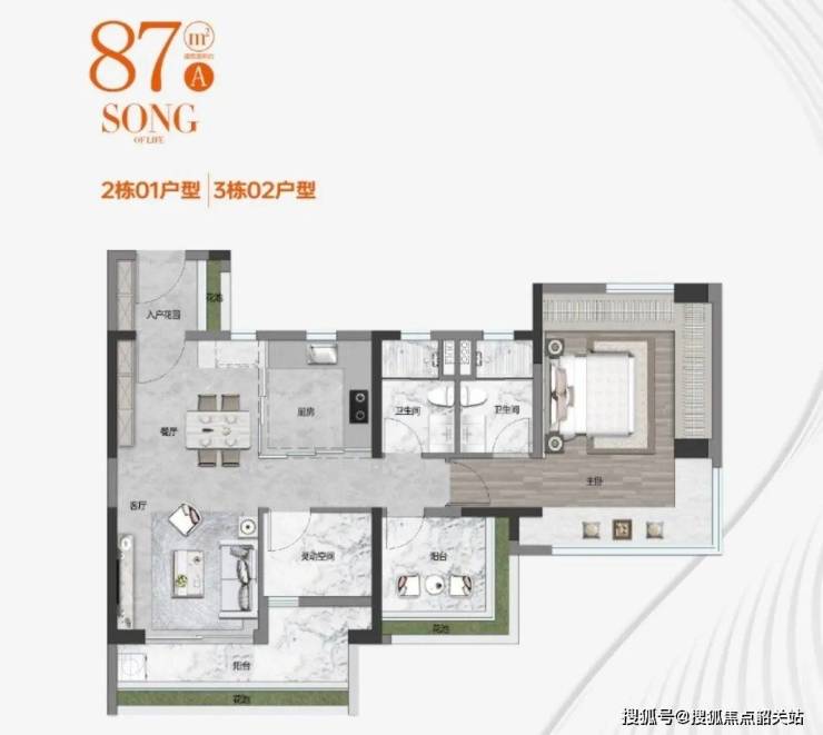 87㎡,分A/B户型,使用率均超100%,单边位,三面可通风对流,四开间朝南,设计优秀。A户型基本与86平相同,都是有入户花园,虽然B户型取消了主人房720度观景飘窗设计,但整个房间的空间感会显得大一些。