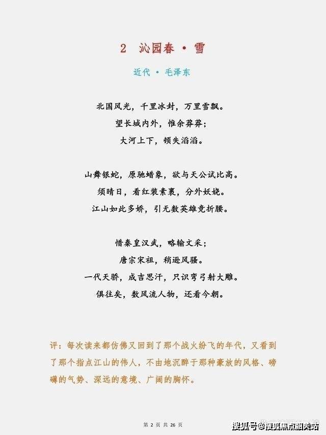 《沁园春·雪》是毛主席创作的一首词。该词上片描写北国壮丽的雪景,纵横千万里,展示了大气磅礴、旷达豪迈的意境,抒发了词人对祖国壮丽河山的热爱。下片议论抒情,重点评论历史人物,歌颂当代英雄,抒发无产阶级要做世界的真正主人的豪情壮志。全词熔写景、议论和抒情于一炉,意境壮美,气势阪宏,感情奔放,胸襟豪迈,颇能代表毛主席诗词的豪放风格。