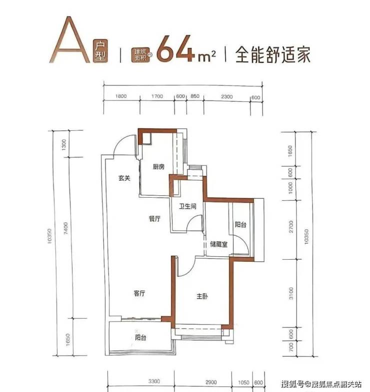 项目面积最小的64平南向户型,户型阳台和主卧朝南,朝向比77平的北向更占优势。