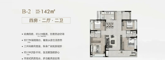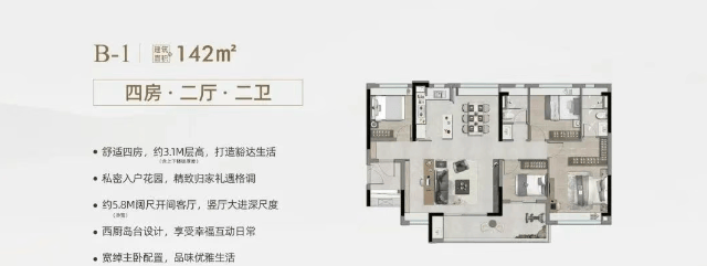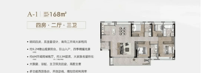 137-142-168㎡四房:2梯3户私密配置,约9米超宽阳台、3.1米层高,部分户型设独立玄关、中西双厨,满足高端改善需求。