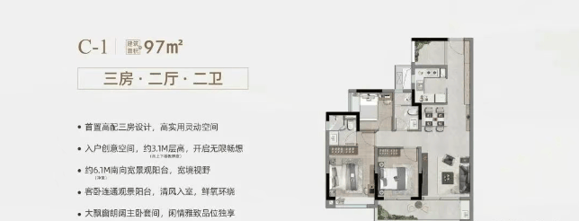 97㎡三房:经典竖厅布局,三开间朝南,配备约6.5米阳台,主卧带飘窗,适合首置刚需家庭。