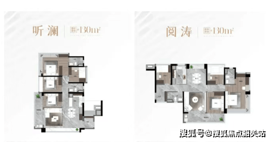 130㎡四房:带入户玄关,南北对流,景观阳台约6.9米长,主卧套房设计,带270°大飘窗。均价3.9万起,总价约582万起。