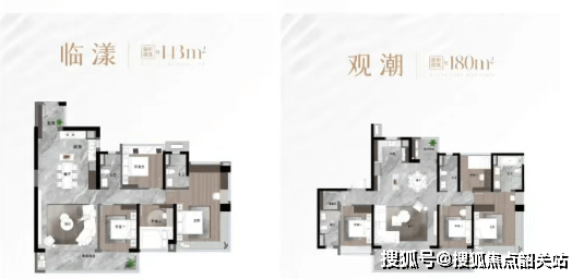 180㎡四房:四开间朝南,入户玄关处带储藏室,超大方厅,南北双阳台,双套间设计。单价5-7.1万/㎡,总价约900万起。