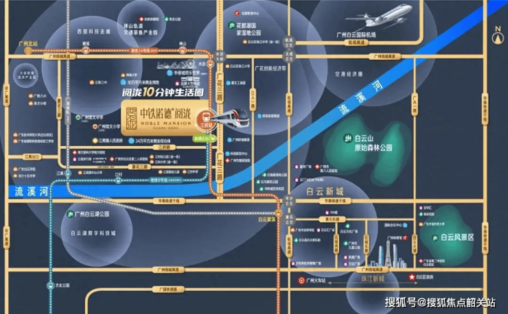 路网交通: 项目周边形成“三横三纵”立体路网:华南快速、广花一路、机场高速纵贯南北,白云湖大道、夏花一路、黄金围大道横连东西。从项目出发,驱车约20分钟可达白云新城商圈,约25分钟直达天河城商圈,约30分钟覆盖番禺万博CBD。对比竞品:某盘宣称“5分钟上高速”,实测需绕行3公里村道;而本项目出门即达主干道,通勤确定性更高。