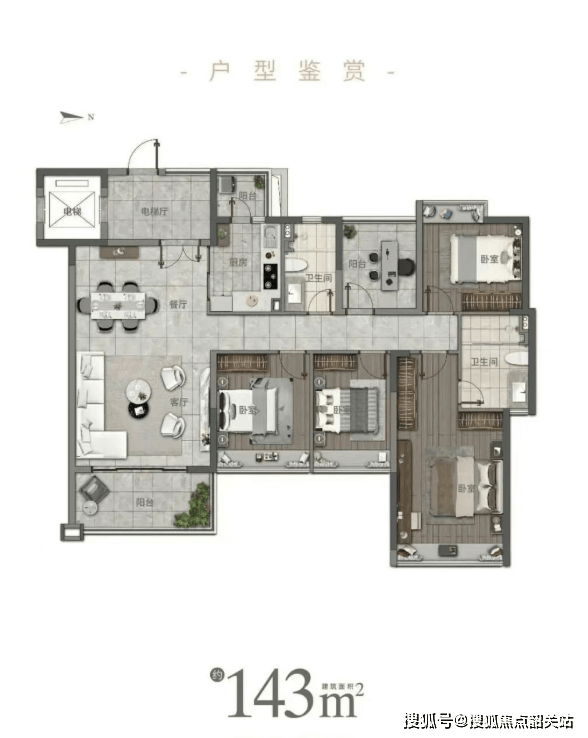 9层稀缺小高层产品:143㎡五房采用1梯2户尊崇配置,东南向瞰中心园林与山湖盛景。