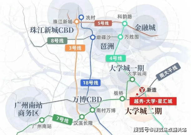 项目距离地铁4号线新造站步行约900米。早高峰时段实测步行耗时约11分钟,虽非“地铁上盖”,但在当前广州外围板块中属于可接受范围。搭乘4号线,4站可达琶洲、5站抵达金融城,且可在万胜围、车陂南等站点换乘5号线、7号线及8号线,实现与珠江新城、天河智慧城等就业中心的快速连接。若选择自驾,项目紧邻南大干线与金光东隧道,经此路线,10分钟内可抵达万博CBD,30分钟内覆盖琶洲、金融城、珠江新城等主要商务区,通勤效率较为均衡。
