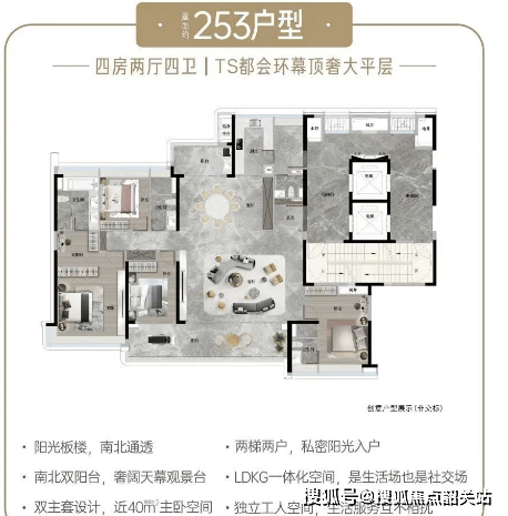 以 140㎡四房为例,南北双阳台(7.5 米宽幕阳台)、四开间朝南,实用率超 85%;253㎡五房专梯专户,10.3 米巨幕阳台 + 双主卧套房,总统级居住体验。